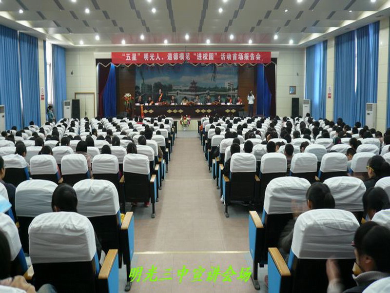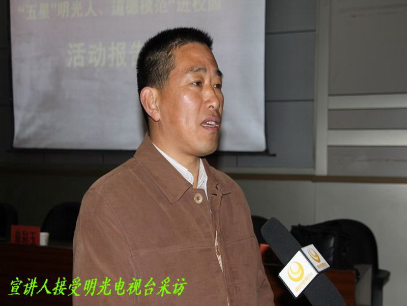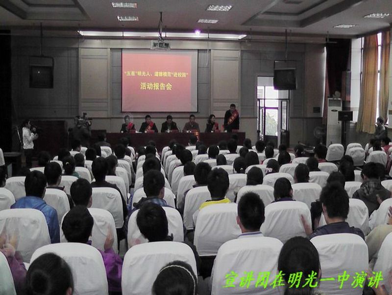 明光市委常委、宣传部长杨文萍出席首场宣讲会并作讲话。她说,为了加强思想道德建设,弘扬明光道德模范的先进事迹,在全市营造良好的社会风气,我们举办第一届“五星”明光人、首届道德模范“进校园”活动,力求通过身边人、身边事教育影响全市人民,引导人们摒弃不文明、不道德的行为;同时通过家庭教育、学校教育、社会教育相结合的办法感动下一代,为中学生做一次心灵洗礼,促使他们健康成长、早日成才。