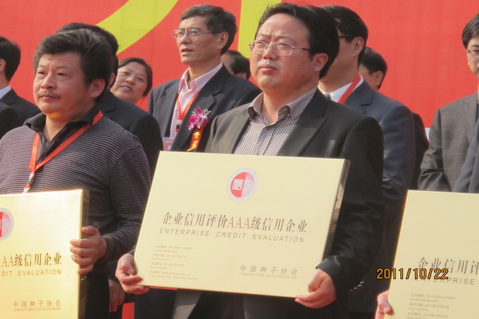 会议选举产生了中国种子协会第五届理事会,皖垦种业再次当选为理事单位。会上,中国种子协会公布了2011年全国种子企业信用评价结果,皖垦种业被评为中国种子行业AAA级信用企业,由国家农业部党组成员、中国种子协会会长梁田庚亲自授牌。