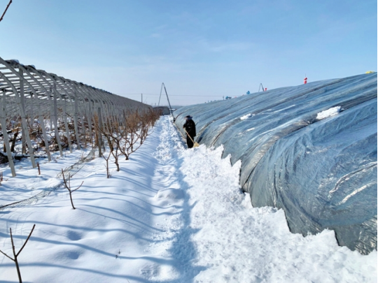 积雪对砀山果园场200多个大棚构成塌棚风险,果园场组织人员及时清理大棚积雪,守护了大棚安全。